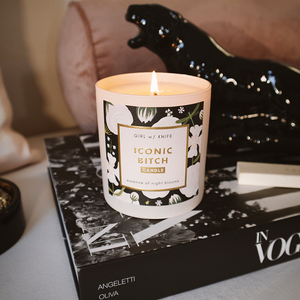 Iconic Bitch Candle. Essence of Night Blooms. Inspired by the secret nightlife of botanicals, illuminated by the majestic and enigmatic presence of a dragonfly. An infinitely iconic bitch in the wild.